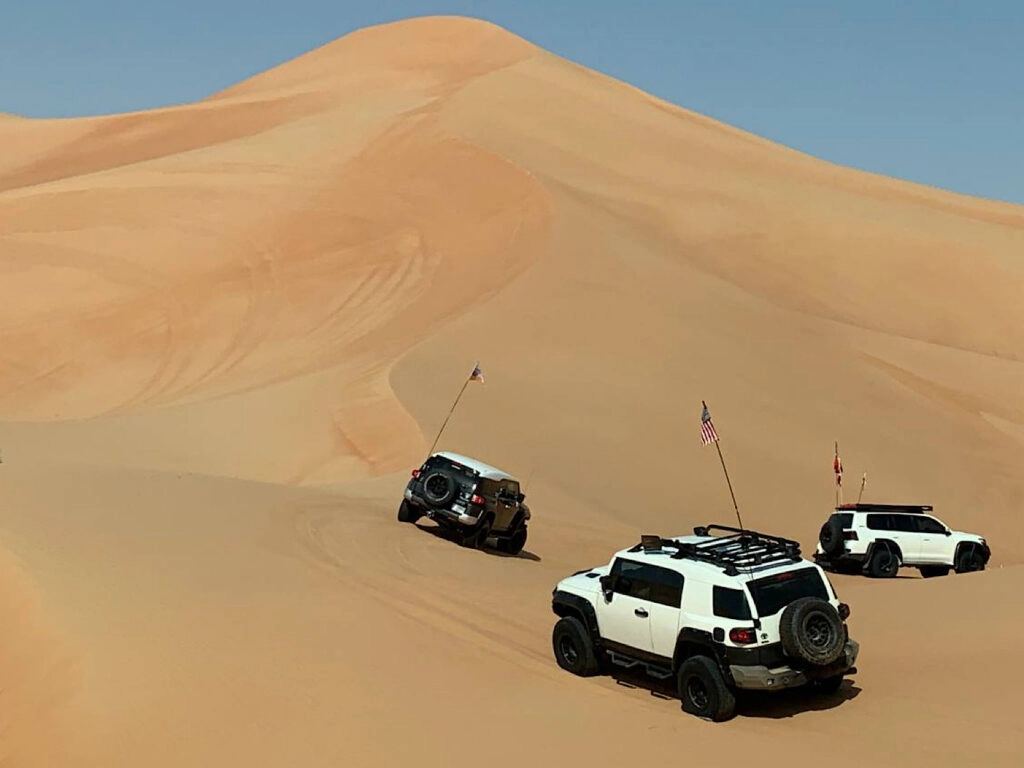 This was the group’s first official drive in Sweihan. After a quick safety briefing which focused on the peculiarities of Sweihan desert the convoy warmed up on some small dunes near the meeting point and progressed swiftly to larger and steeper dunes.