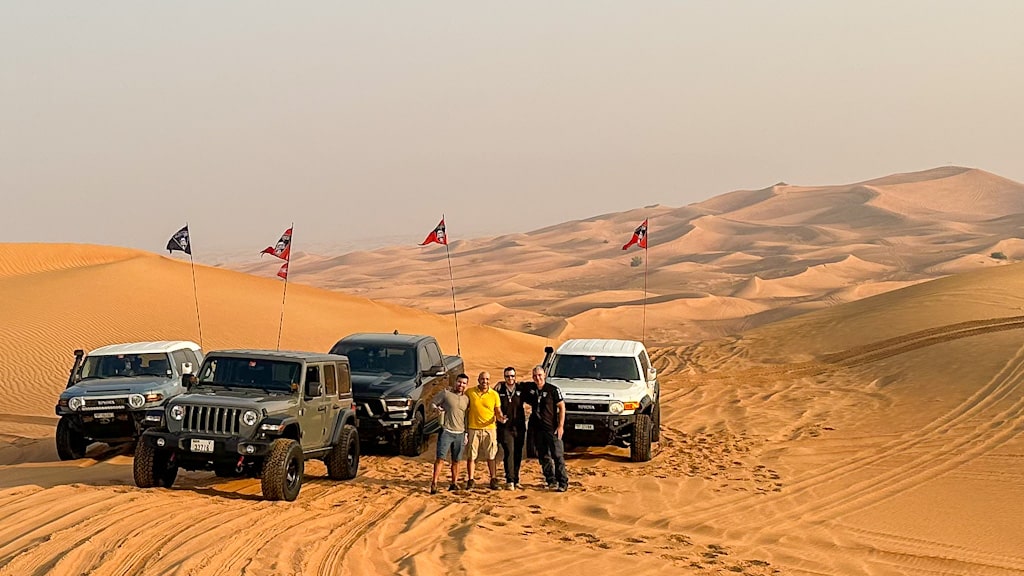 Iftar bowl provided one last opportunity to get the adrenaline pumping. Making the most of having the whole dune to ourselves, opening up the throttle to climb to it’s peak and the pièce de résistance; stopping in Desert Fellas formation just below the summit to take in the view for a few moments before making our way to the our exit point to inflate on time.