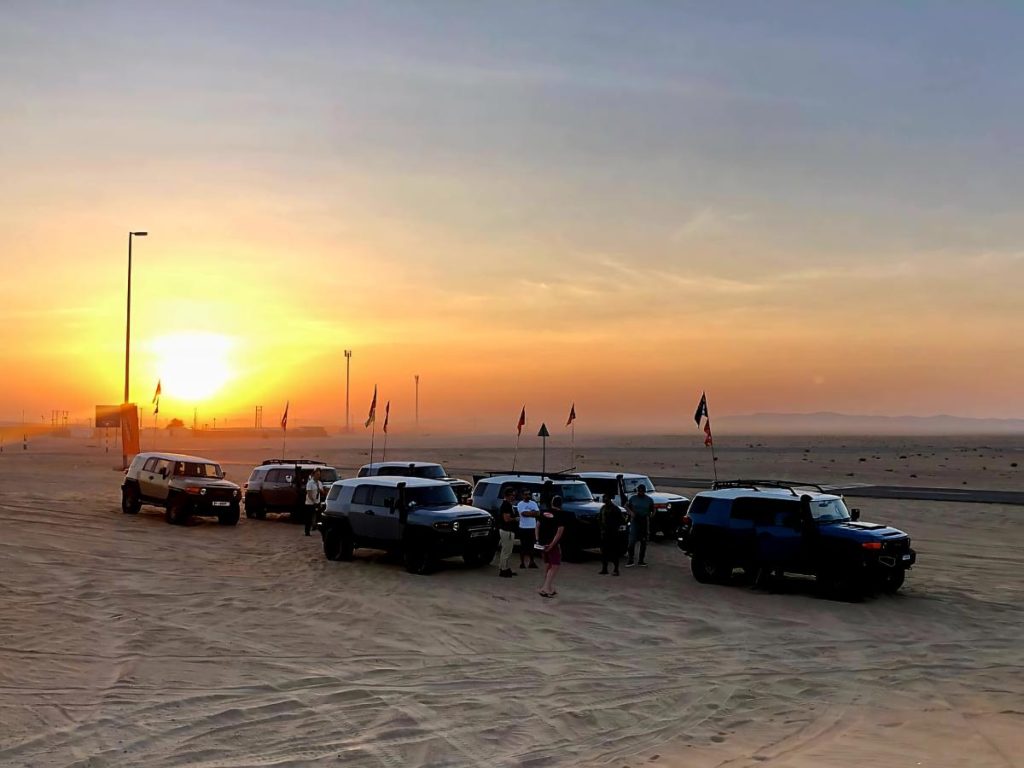 What an epic morning it was! We started with our convoy deflating tires at the Sweihan drag strip, with the sun rising over the dunes as a stunning backdrop.